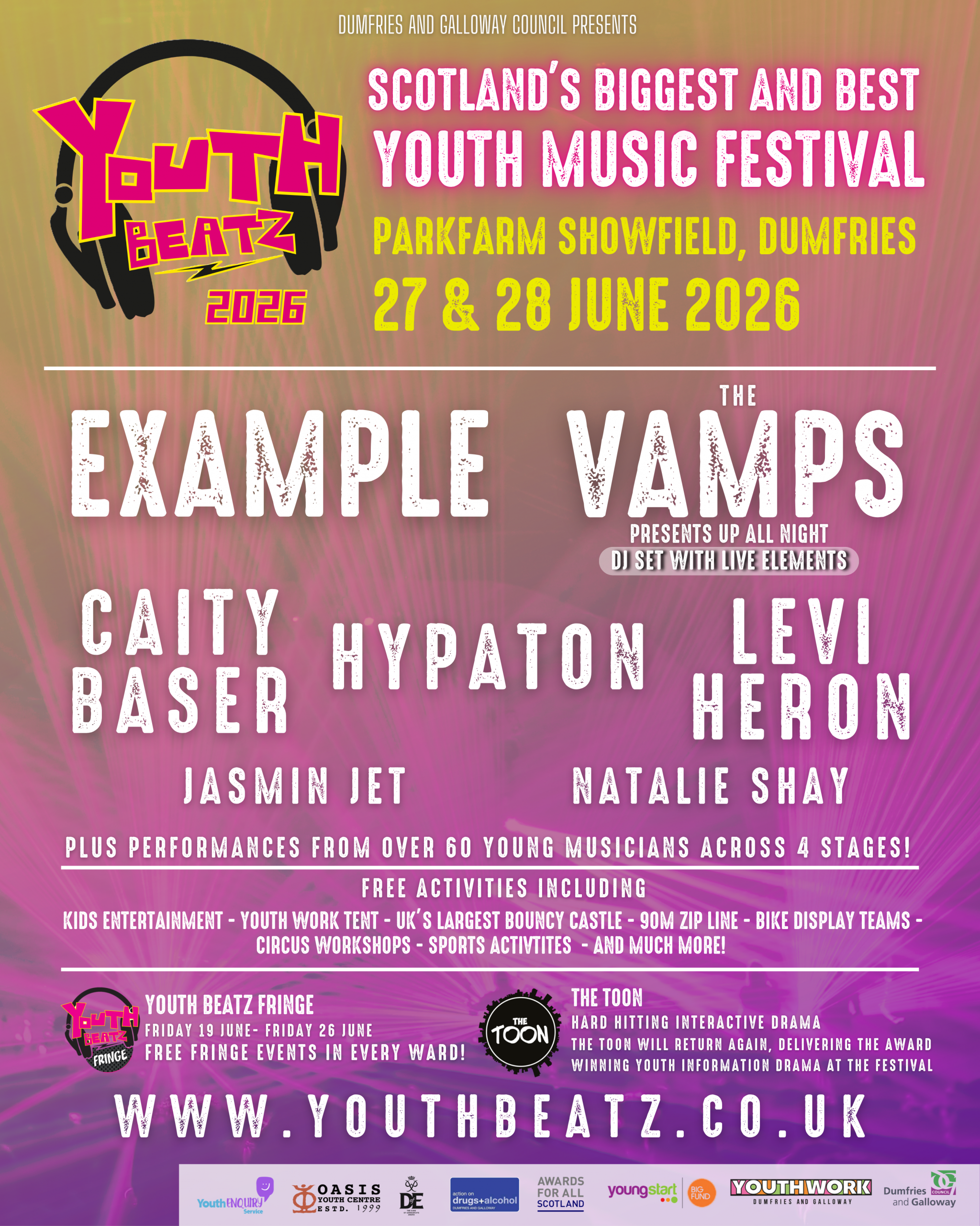 The Youth Beatz Fringe Festival will run in the lead up to the Youth Beatz Main Days, with an event in each Ward area. The Fringe provides activities for young people and their families across our region, with the events themselves being designed by a group of young volunteers with a focus on providing opportunities that are entirely free and accessible geographically to communities across Dumfries and Galloway.